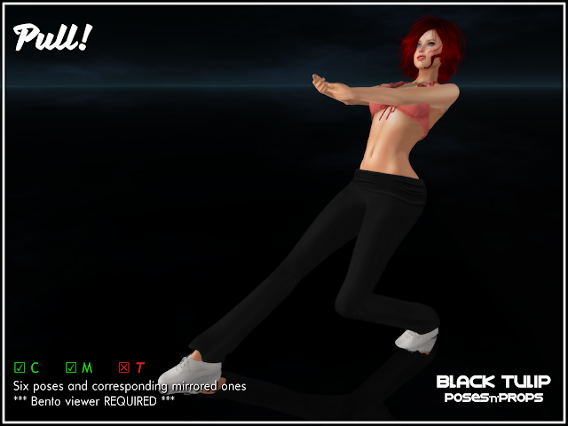 The boudoir sets of poses have each the flat feet and high heel version per pose. The Pull! set is our first Bento poses set. A Bento enabled viewer is required to see the poses even if you don't own Bento hands.